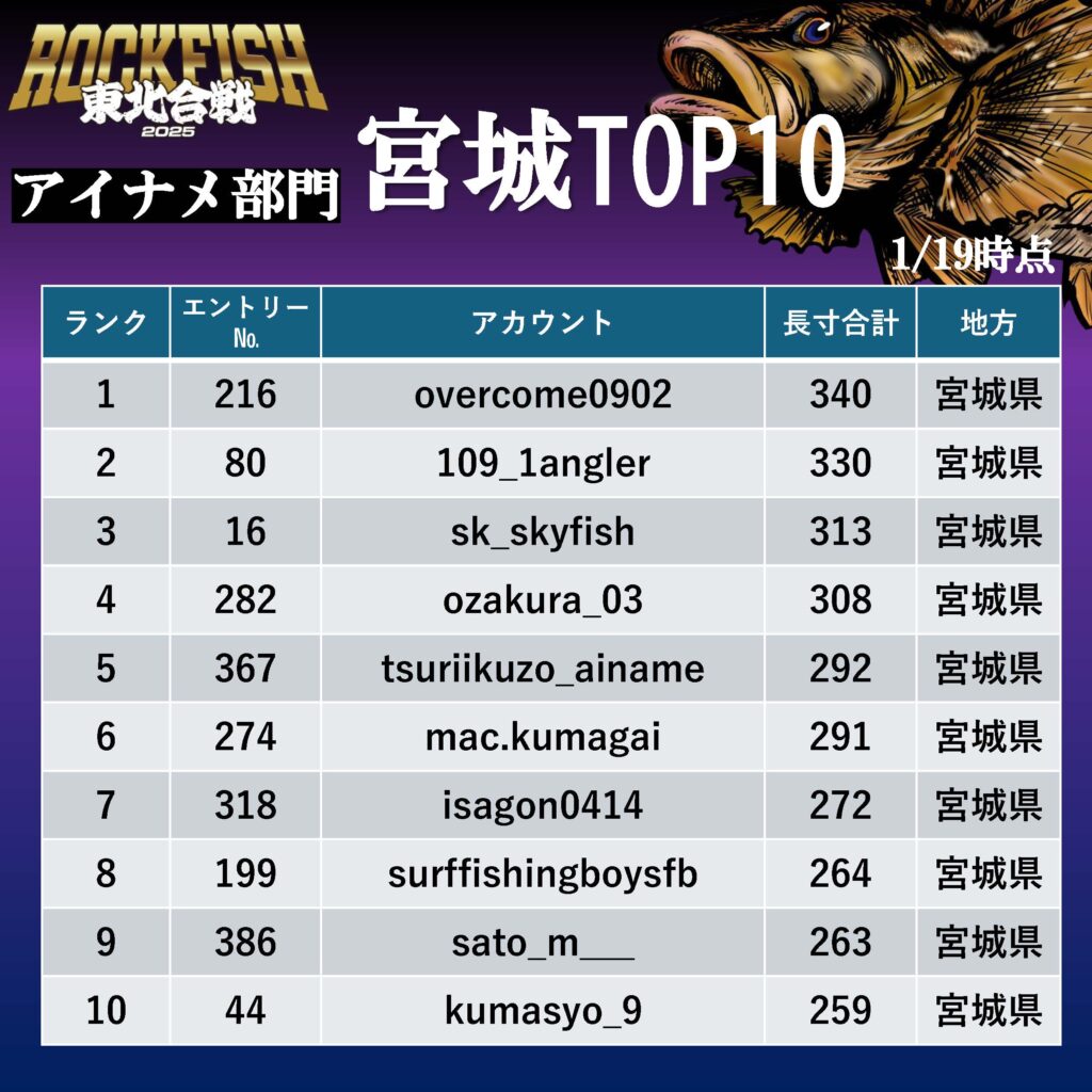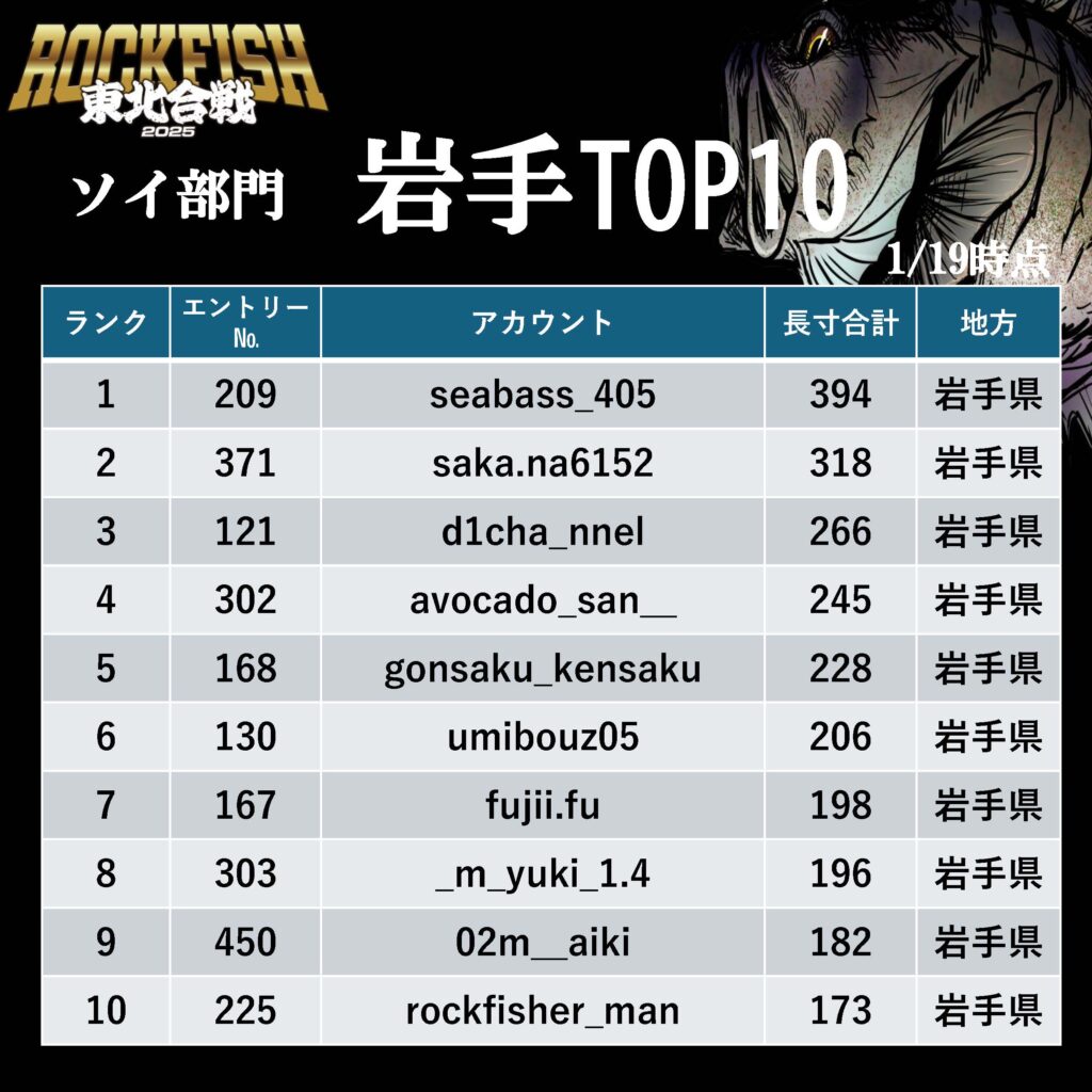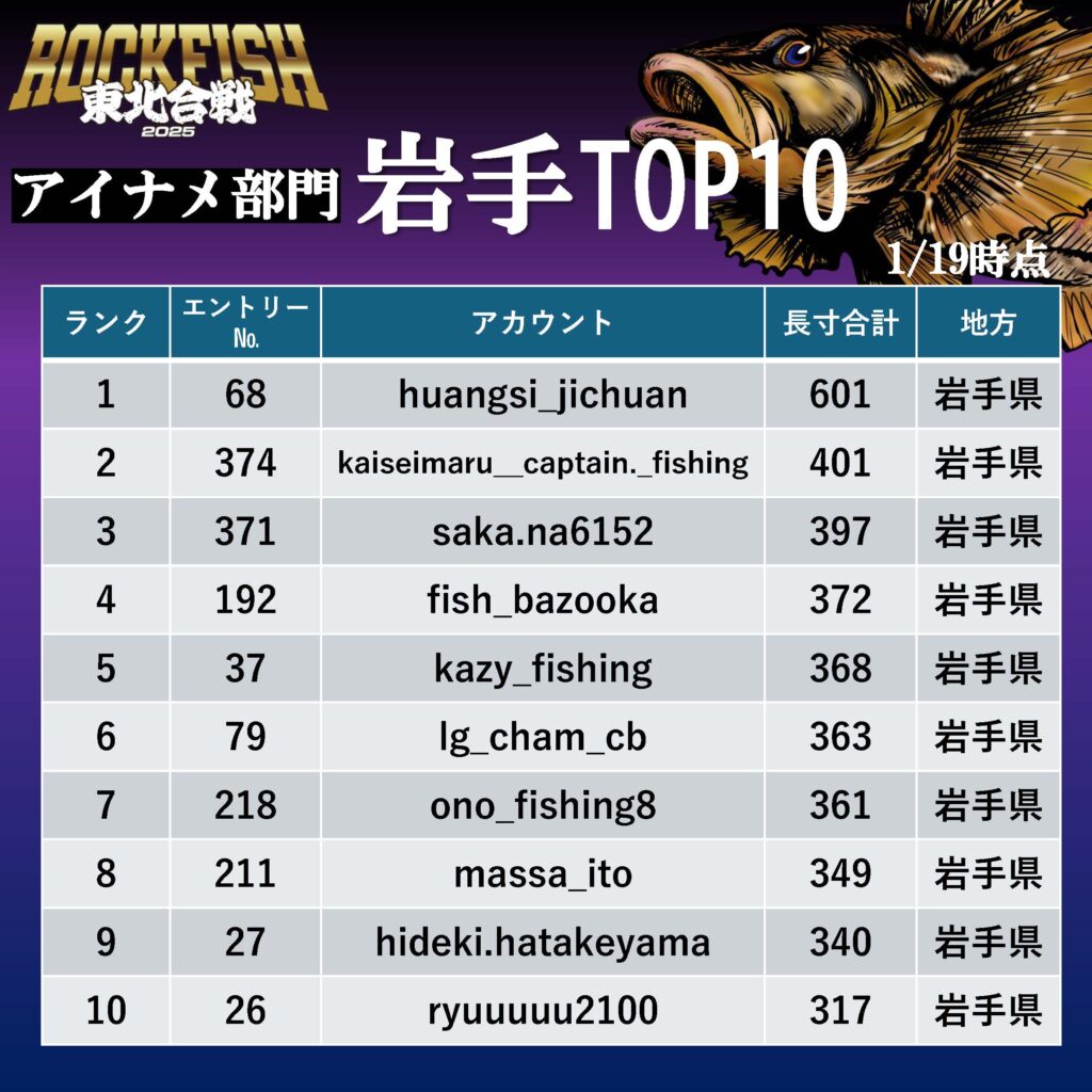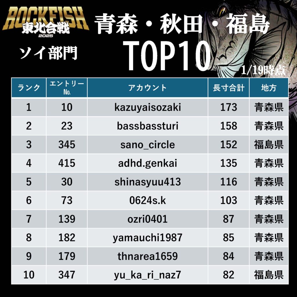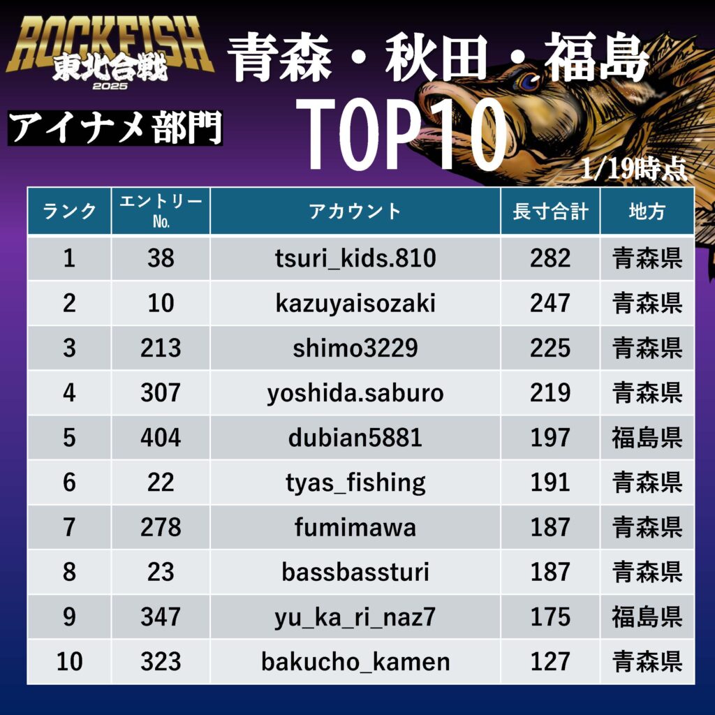 東北合戦 2025 アイナメ部門 暫定ランキング